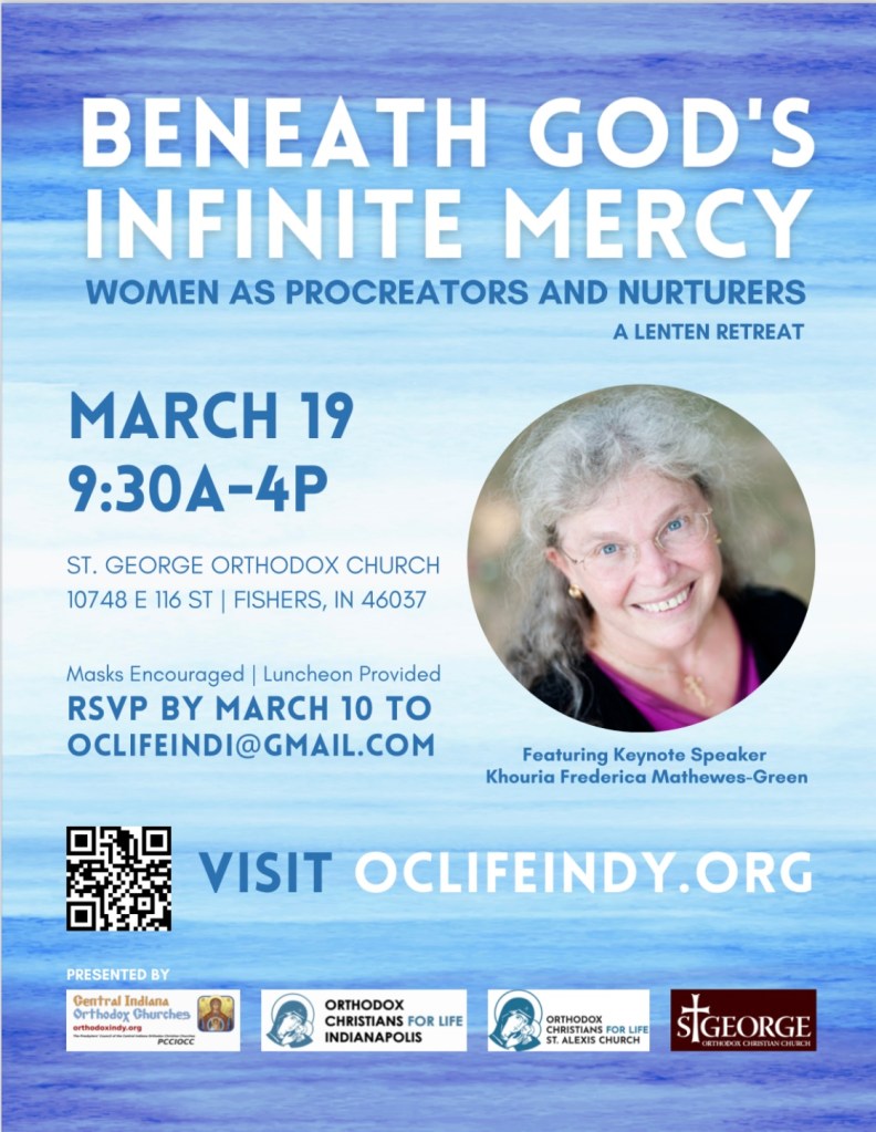 Join us for a Lenten Retreat focused on life choices and exploring resources women and families can avail in times of crisis. Khouria Frederica Mathewes-Green, author and NPR commentator, will discuss the Theotokos as refuge, nurturer and healer, the history of procreative challenges in the early church and the urgent necessity for compassion within faith communities for all those confronting life choices.
