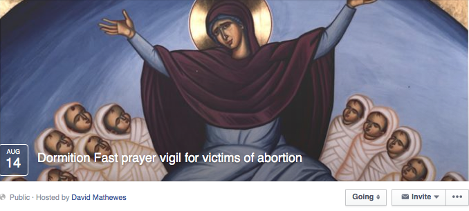 To join, type this name in the search box at the top of your Facebook page: Dormition Fast prayer vigil for victims of abortion. From David Mathewes, organizer of the event: