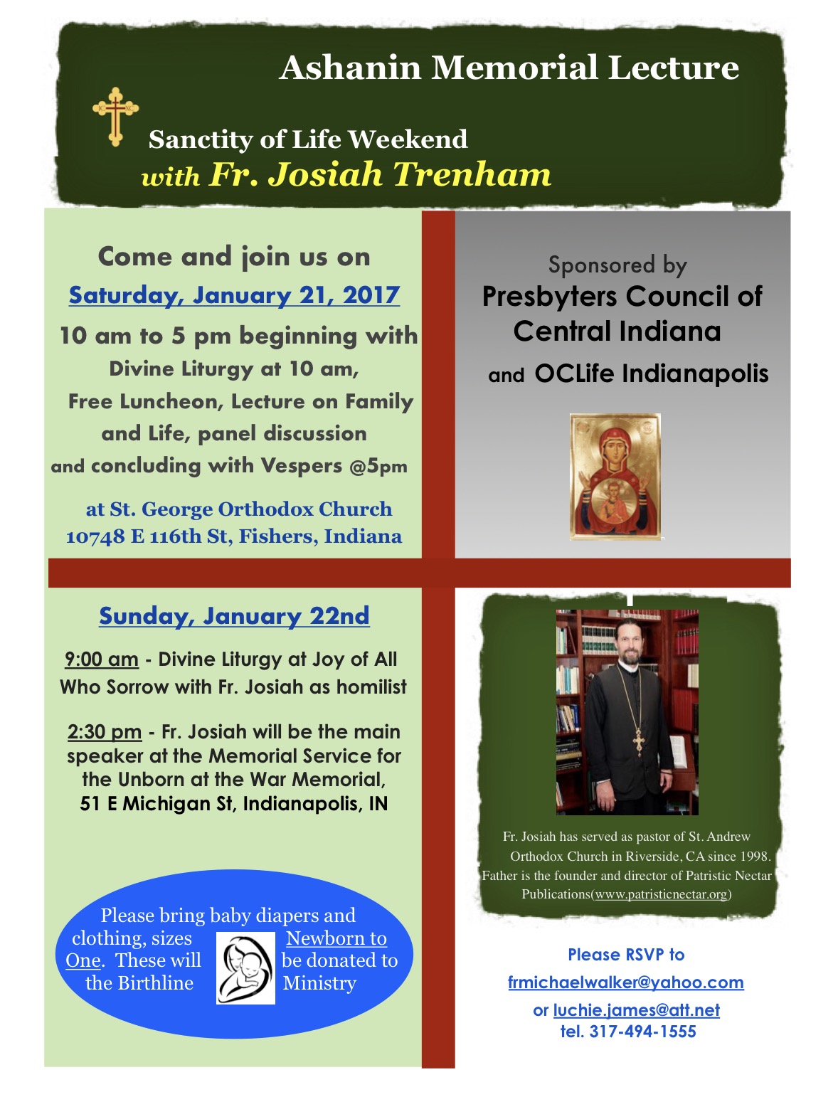 Fr. Josiah Trenham, pastor of St. Andrew Orthodox Church in Riverside, CA, a strong Pro-Life advocate and an Orthodox priest servant of God is coming to Indianapolis to speak on the sanctity of life and the family next week, Saturday, January 21st at St. George Orthodox Church, 10748 E. 116th St., Fishers, Indiana. (Fr. Josiah’s bio)