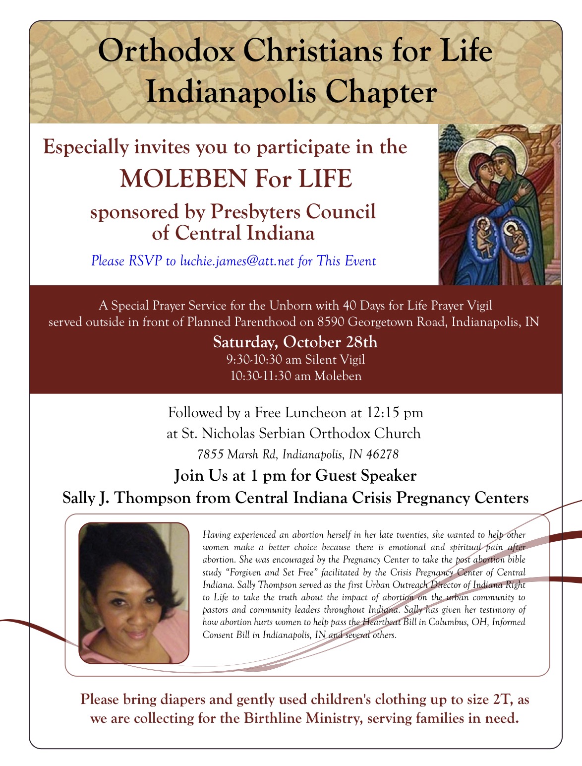 We will have a free luncheon at 12:15 pm at St Nicholas Orthodox Church on 7855 Marsh Rd, Indianapolis, with our guest speaker, Ms. Sally Thompson from the Central Indiana Crisis Pregnancy Center. Hope to see you then! May God bless this event for His glory.